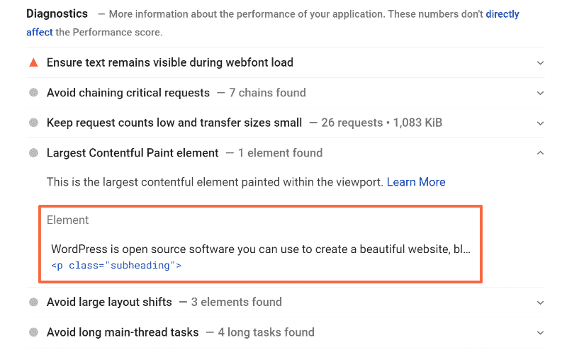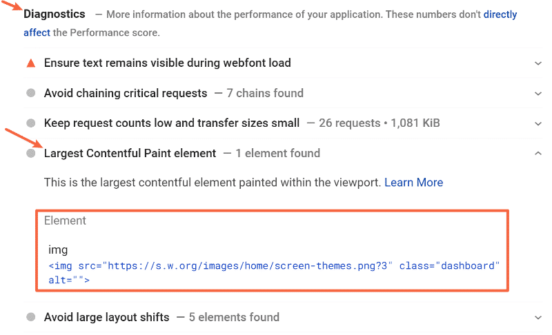 Pour connaître votre score, il suffit de regarder la section “Diagnostic” et d’agrandir l’onglet “LCP”. Dans cet onglet, Google affiche le code HTML utilisé pour définir le LCP. Cela vous permet de savoir quel est le contenu considéré comme “important” par Google.
