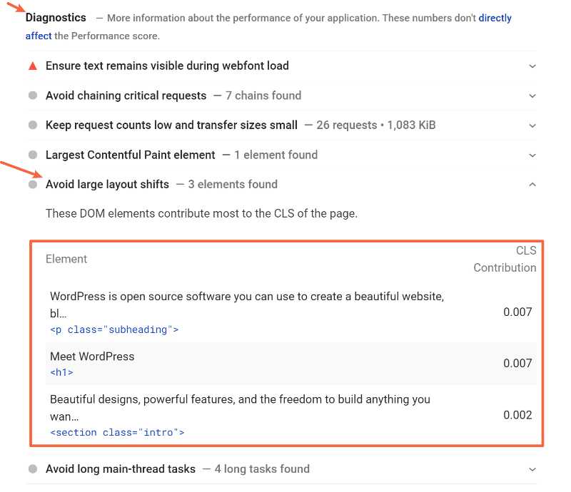 Afin d’identifier chaque élément qui pose problème et affecte votre score, allez dans la section “Diagnostic” et agrandissez l’onglet “Evitez les changements de mise en page importants”.