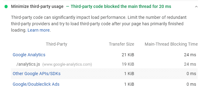 Que faire si vous obtenez un mauvais score TBT ? Allez à la section “Diagnostic” et ouvrez l’onglet “réduire au maximum l’utilisation de code tiers”. Ici vous verrez ce qu’il faut minimiser en terme de ressources provenant d’une application tierce. Si vous ne voyez pas ce problème de performance dans la catégorie “Diagnostic” mais que vous le voyez dans “Audits réussis”, alors félicitations, vous n’avez pas besoin d’optimiser !