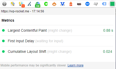 Si vous êtes à la recherche d’une bonne extension Chrome, nous vous conseillons Web Vitals. L’extension vous donne le score des Core Web Vitals pour la page que vous êtes en train de parcourir :