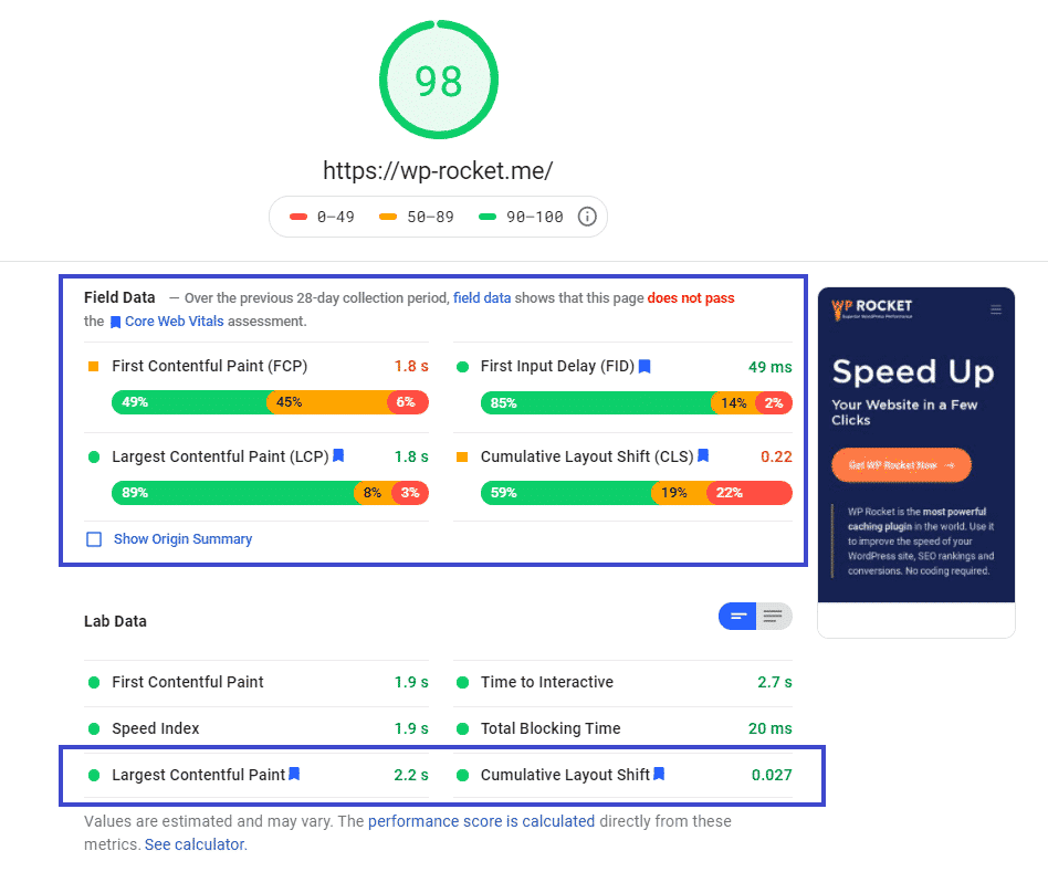 - Ce n’est pas un problème s’il n’y a pas de données de terrains pour faire un test. Il se peut tout simplement qu’il n’y ait pas assez de données basées sur de vrais utilisateurs. Ceci ne va pas impacter vos Core Web Vitals car PageSpeed Insights prendra simplement en compte les données de laboratoire pour calculer les résultats. Enfin, si vous vous demandez pourquoi le First Input Delay n’est pas affiché dans les données de laboratoire, vous aurez la réponse dans quelques instants.