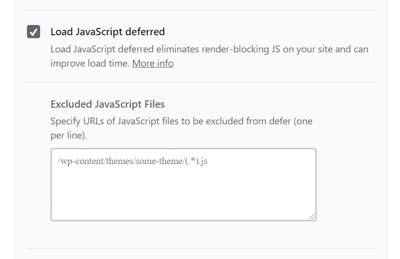 WP Rocket diffère tous les fichiers JavaScript pour une performance maximale. Cependant, si un fichier devait être exclu du report, il fallait auparavant recourir à un plugin d’aide. Avec WP Rocket 3.8, nous avons inclus une zone de texte dans l’interface utilisateur afin d’exclure facilement tout fichier JavaScript du chargement différé. Dans l’onglet Optimisation des fichiers, vous pouvez maintenant activer l’option “Charger le JavaScript en différé” et indiquer les fichiers JavaScript que vous souhaitez exclure de l’option: